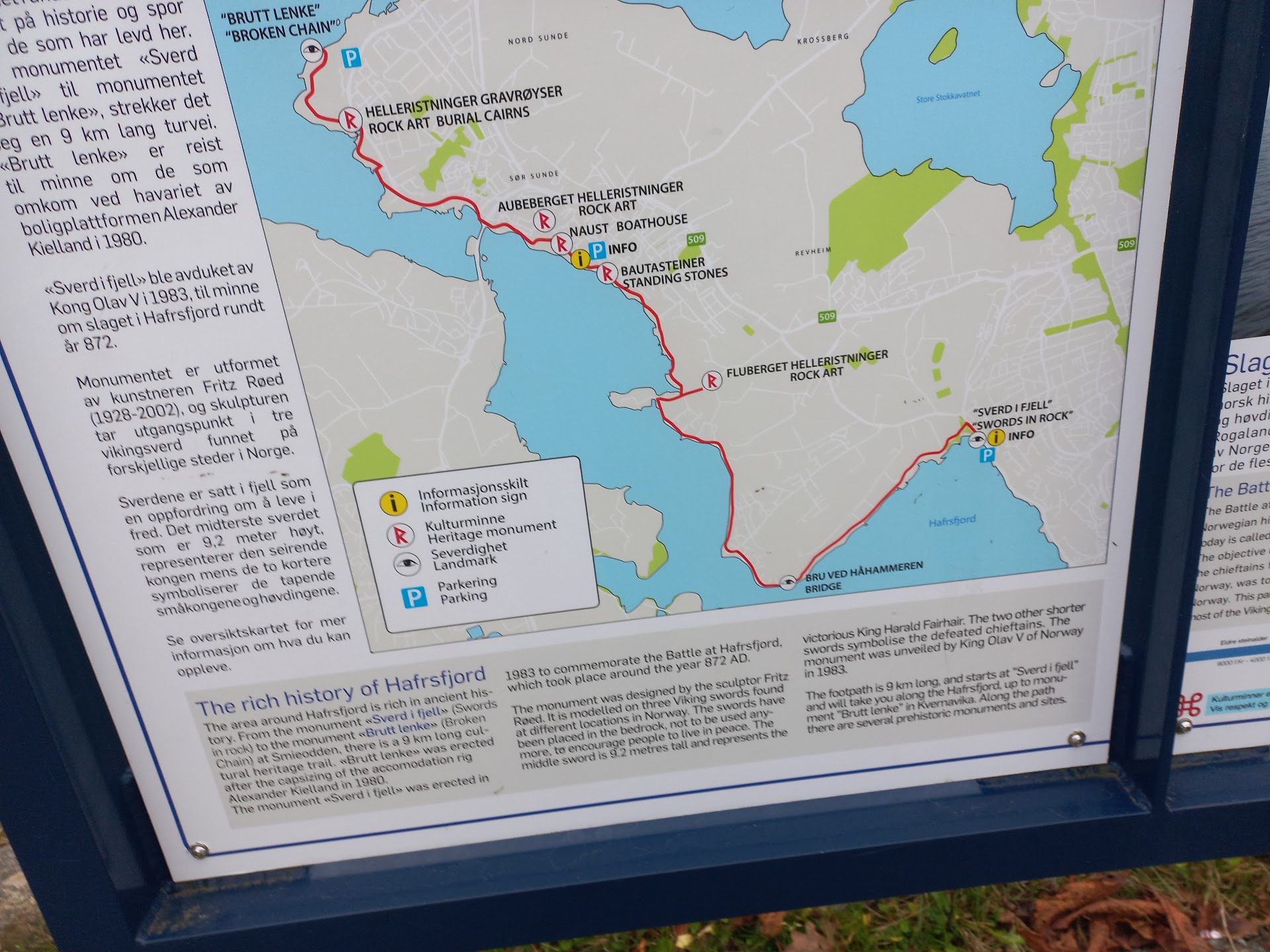 The three enormous swords are truly striking — powerfully shaped, beautifully placed, and well-proportioned. The symbolism, referring to the Battle of Hafrsfjord and the unification of Norway under Harald Fairhair, is strong and tangible. While I didn't see any information boards on site (or simply missed them), I had read up beforehand, which made the visit all the more meaningful.