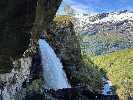 An absolutely beautiful hike. We did this starting at the cruise ship dock, which leads to 6mi RT with 2,000ft of climbing. To begin, I'd advise just walking up the road to the Hotel Union across from the Fjordcenter. Leave the lower cascades to your return trip as this lets you get ahead of some crowds. Once you start climbing, the trail is consistently steep, with lots of well-placed rocky steps. At the top, be sure to take the spur trail behind the waterfall which starts on the right side of the flat area at the top of the falls.