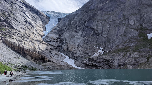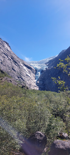 Il Briksdalsbreen o meglio conosciuto come ghiacciaio di Briksdal, è uno dei ghiacciai più conosciuti e accessibili del ghiacciaio Jostedalsbreen, ed è parte del suo parco nazionale. Si trova nella municipalità Oldedalen di Stryn e ai piedi del sentiero che conduce al ghiacciaio troviamo il Briksdalsbre Mountain Lodge, che è un negozio di souvenire con zona ristorazione, nonchè ultimo punto accessibile con i propri mezzi di trasporto o pubblici e da lì addentrarsi lungo il sentiero naturalistico che costeggia il torrente del ghiacciaio, fino ad arrivare al Briksdal. Il sentiero è lungo 3Km e in salita, è avvolto dal verde e dalla bellezza che regala il torrente con i sui colori e le sue travolgenti cascate. Il percorso naturalistico è possibile farlo interamente a piedi o trasportati dai Troll Car che ti accompagnano fino ad 1Km dal ghiacciaio, l'ultimo tratto va fatto a piedi. La vista del ghiacciaio Briksdal con quel suo azzurrino dovuto all'ossigeno immagazinato nei sui cristalli e del lago verde turchese ai suoi piedi, è veramente mozzafiatante, una meraviglia della natura unica nel suo genere. Vale la visita. Consiglio vestiario idrorepellente con copertura anche per la testa e scarpe da Trail in gorotex. Siamo in un sentiero di montagna fra torrenti e cascate, il percorso in alcuni tratti è scivoloso e quando si passa dalle cascate ci si bagna, il meteo varia rapidamente. Il punto ristoro è ben organizzato e i piatti che servono sono tipici del luogo e molto buoni, il...