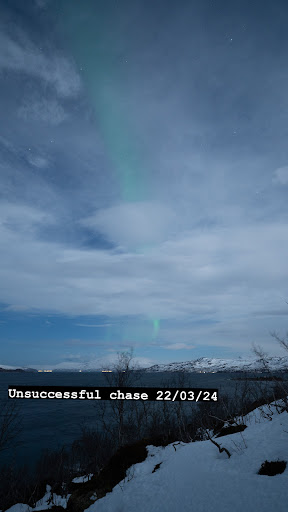We did 2 minibus chases on the 21st (Marius and Stan) and 22nd March (Jonas and Stan). We actually arrived in Tromso on Saturday the 16th March 2024 and because we landed at 21:00 there were no tours available so we decided to rent a car, however, as the forecast was really bad snow we ended up just going to our hotel (and in hindsight we wouldn’t know what to look for anyways, and I did ask Chasing Lights team and they did manage to see the Northern Lights that day). We then travelled to Kirkenes for a few days and then got on the Havila cruise and cruise from Kirkenes back down to Tromso. The 5 days we were in Tromso, Kirkenes and out at sea (16-21st) we did not see the northern lights as it was very very cloudy and snowing every night. We then decided to extend our trip and stay in Tromso for 2 extra nights (until 23rd) and booked Chasing Lights minibus chase for the 21/03/24 and 22/03/24.