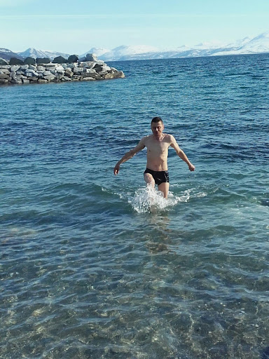 On the southern peak of Tromsøya, "Sydspissen", is this park on the beach... it is like a open area for all poeple, they come there to play with their children or make barbecue and a group of poeple come every friday to take a bath in the sea. I saw this and talked to them, is it not cold? but they told me, yes it's fresh and the feeling coming out of the water is great, why do you not try? And so i took a bath in the sea, water 4°C, air 5°C... It was very fresh and really cold, but the feeling, when I was in my clothes, I was like high and all over my body was a tickling feeling present, the poeple there gave me applouse for my...