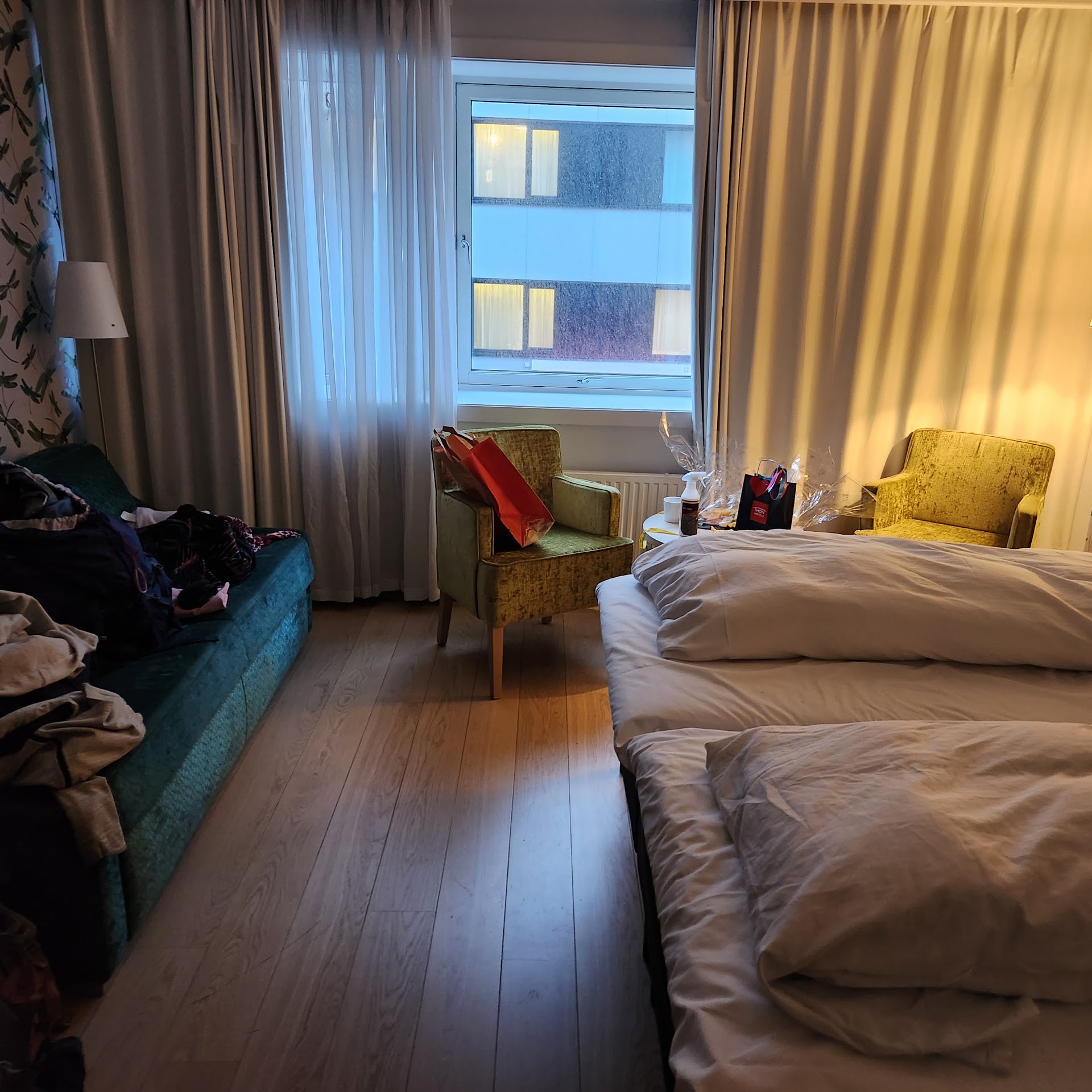 This hotel should be a four star, not a three star, and if it isn’t the number one in Tromsø i would be surprised. Firdt, the staff: everything you would expect and more. Helpful, kind, polite, knowledgeable, and goes the extra mile for example, when i was leaving very early on my check out morning, and would miss the breakfast, the reception staff inquired if they could make up a breakfast box for me. Wow! I didnt have to ask, they just offered. And when my key failed to work, another was produced immediately, literally within seconds. The staff person even gave me his direct line, sothat if this happened agon, i could call him and he could come to me, rather than me having to come to reception to him. |Second, the rooms. I only had one room a superior double, but i did peek into a couple of oyhers as they were being cleaned and they appeared uniformly well appointed. Housekeeping was friendly and asked me if there were anything specific i needed, when i saw them in the hallway. Again, going out of their way to help. My room was large, even by US standards, when tend to find Europen hotel rooms pokey. I was on the ninth floor with views of downtown and the Dom Kirche, and the snow covered mountains beyond. Gorgeous at night! And the windows opened, hallelujah, so i could let in that beautiful, clean Arctic air! The bed was wonderful, the duvet just right, and the tv easy to figure out. Bathroom toiletries were luscious and nicely scented (very unisex) and the hot water was hot and abundant. The towels were good, and absorbent. They were not bath sheets, which i prefer, but i have not found bath sheets in any truly Europen lodgings. The bathrobe was roomy and comfy too!|Lighting in the room was what you would want, some near the bed head, one at the desk area, and overheads available in room and hallway. Ample closet space. Real hangers, and plenty of them. Places for luggage as well as the myriad of things people bring with them on holiday. |Third, the breakfast buffet, which is included in the room price. A nicely appointed dining roomwith free seating and a mouthwatering array of foods. Service was from 6-10 weekdays and. 8-11 on weekends, which makes a lot of sense. I dislike buffets which stop early so you have to get up and ready sooner than you might wish to. The food begins with a choice of cereals and yoghurts with dried fruit and nuts and again, they had plain yoghurt, not those sugary prepackaged things i have seen elsewhere. There was chia pudding as well, a selection of juices, and carafes of water. There was an entire section devoted to lactose free yoghurt and gluten free baked good with a dedicated gluten free toaster. I am not gluten free, but have friends who are, and this was remarkable attention to detail. On the cold buffet one had a choice of at least three different types of bread with various grains and seeds, and gorgeous real butter. Several types of jams were also on offer, as well as fresh fruit including apples, pears and grapes. Salad leaves, tomatoes, cucumbers and several sorts of spreads including taramosalata, chutneys, and pickled vegetables, were presented. Sliced ham, proscioutto, and lox (salmon) was next, along with a few different cheeses. If you still had room, the hot buffet offered sort of a Nordic take on a full English: baked beans in tomato sauce, grilled tomatoes, scrambled eggs, hard boiled eggs, a kind of liver loaf that reminded me of scrapple, meatballs made with chicken but seasoned like sausage, sausages, sautéed mushrooms, broiled cauliflower florets, broccoli florets in sauce, pre made cheese omelette tray bake, and i think that was all. Oh yes, they had something resembling a cross between grits and hot oatmeal and i cant remember what it was called. Two trays of croissants and pastries rounded out the offerings.||I could not have moved if i ate everything, but i was there for five mornings, so was able to sample almost everything. A coffee and tea station was also presented, with teapots to make a good and proper brew. ||The staff here as everywhere else in this hotel was attentive and cheerful. ||I honestly cannot fault this hotel. It is excellent, and when i visit Tromsø again, which i intend to, I shall book in...