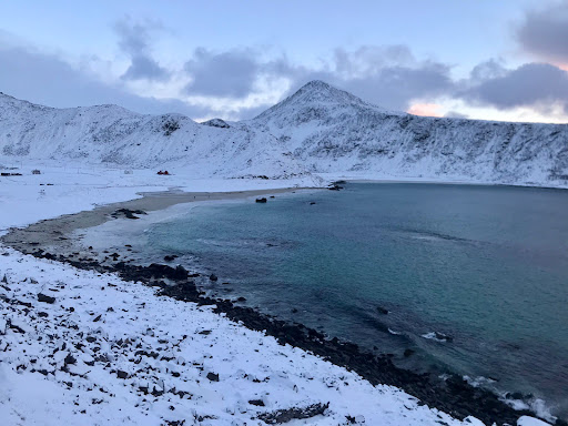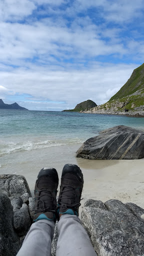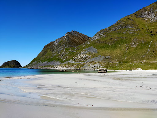 Read moreOne of the best things I did during my solo trip to Norway was make a visit to the Lofoten Islands albeit just a day's visit (July). This is an Arctic paradise! I had pre booked a cycle and picked it up from the airport itself in Leknes. Haukland Beach was recommended to me... and boy, what an amazing cycling ride it was! Not a single soul on the road except for some occasional zooming cars! A beautiful turquoise colored beach, pure white sand, beautiful green mountains with a bit of snow, black rocks on the side, curious looking sheep around, i saw nature in its grandeur. Although the sign says no camping, a saw a few tents pitched. The public toilet there was super clean and I was amazed! It's a great place for family, friends or solo travelers! There are no restaurants around, so carry plenty of food and water. You can hike up the mountain to get some...