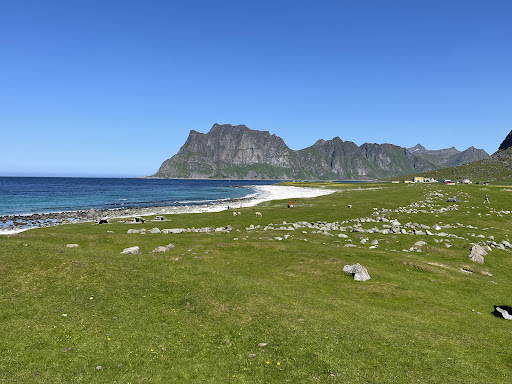 Read moreCar park was relatively spacious, and paying at the exit was easy. The car park had some basic facilities e.g a sink and toilets but no showers. The beach was beautiful, shaped by mountains either side, and boulders along the sea front, with picnic benches to enjoy the view. It has to be said that I think Haukland beach around the headland is the ‘prettier’ beach but Uttakleiv felt like it had more character and grit to it. It also had a very large population of sheep who were not shy and really added to the charm...