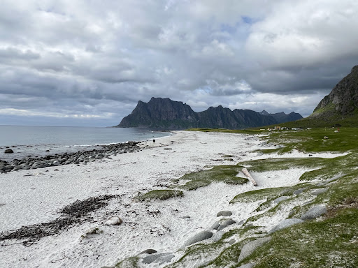 For those on foot or bike, there’s a scenic route around the mountains Mannen and Veggen that leads to the beach.