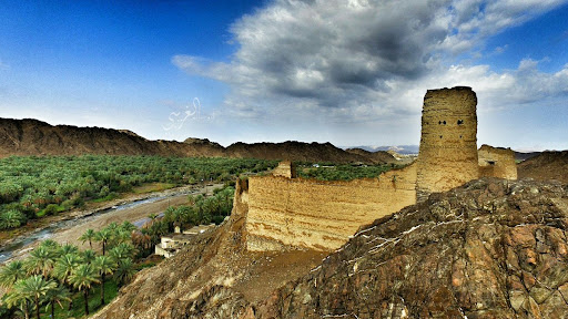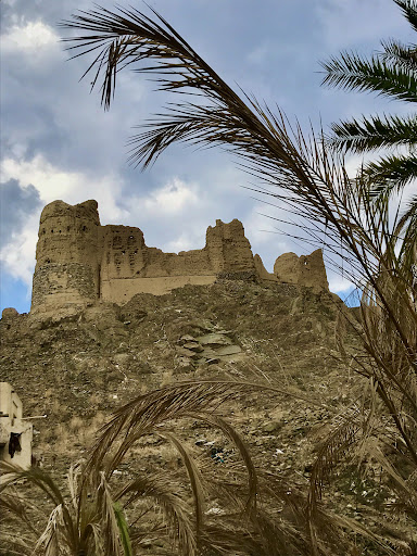 The fortress is located on a high rocky bump Surrounded by palm trees groves A high fortress with three towers Wind Tower Mutamer Tower Salymen Tower