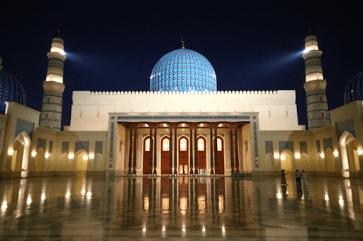 The Sultan Qaboos Mosque in Sohar is very different from other royal mosques and is built in the style of Persian and central Asian Islamic architecture with a touch of Omani architecture. The massive mosque has a large garden, three main entrances, four minarets, and a large blue main dome. The mosque also uniquely integrates wood in its design in a way not common among Omani royal mosques.