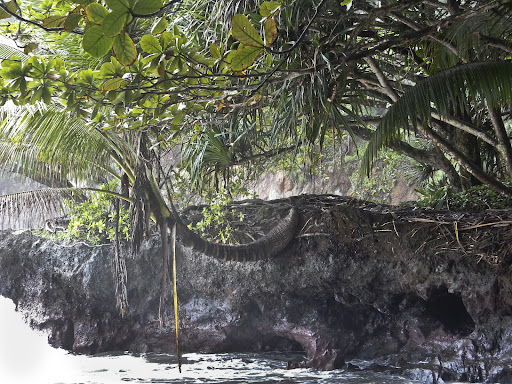 Access to Onomea bay and falls are from the Old Mamalahoa Highway. There is limited parking on road. From trail head marker, it is step and wet to first cove. Here the palm trees grow out horizontal from rocky shore. Go over headland of Botanical garden to Onomea falls. From here you can cross stream to narrow headland to view the bay itself. No swimming here. Trail is wet and continues back up to road. Good ½ hour walk.