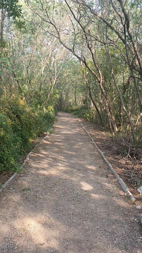 Inside the forest, there are two marked paths. One is labeled as the children's park, which also serves as a trekking path, and the other is for walking and jogging. The children's park route eventually leads back to the main entrance after a loop, but the jogging trail seems to go on endlessly without clear direction or endpoint.