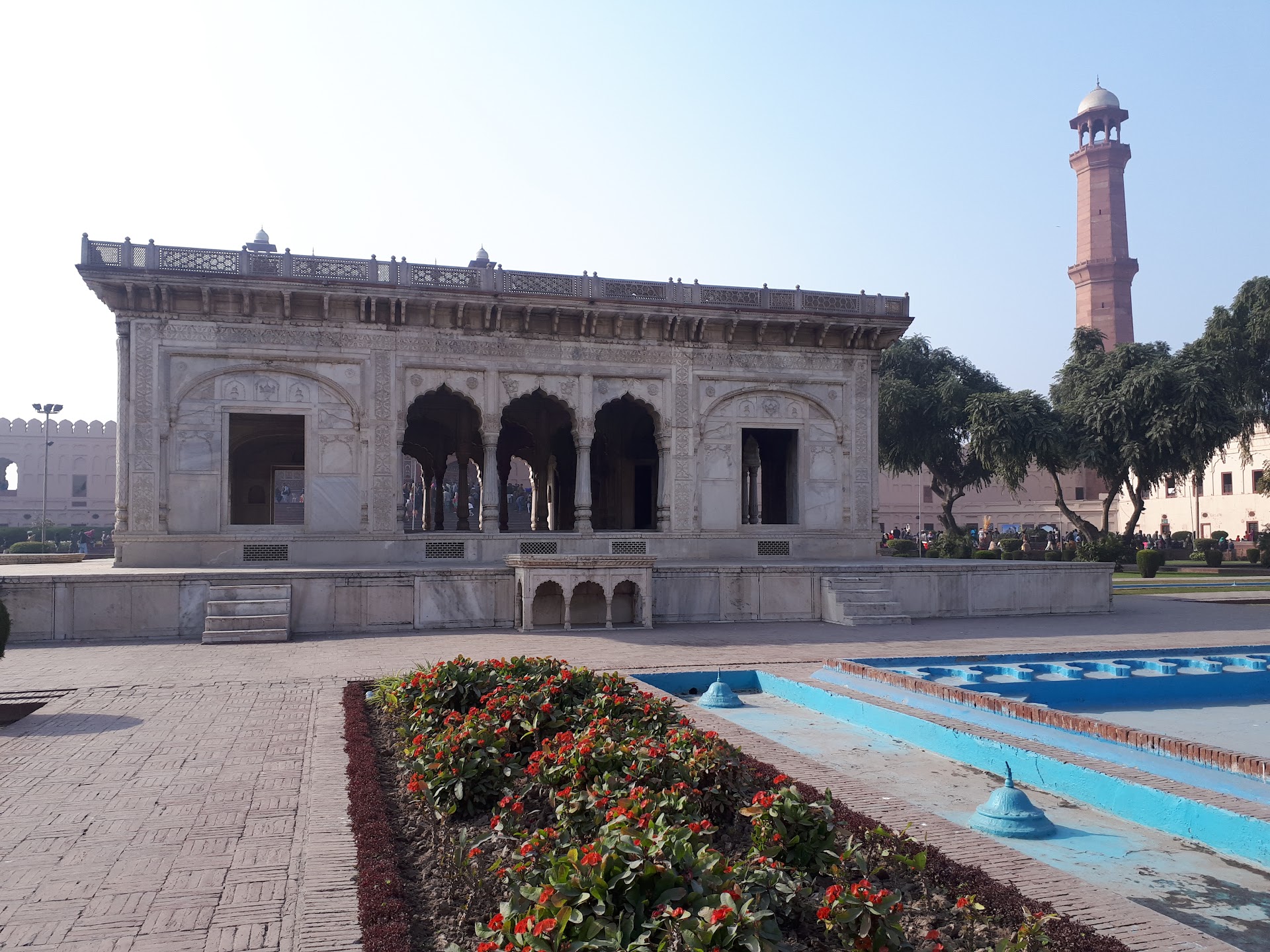 Once known as Serai of Aurangzeb, the Mosque forecourt would be thronged by the cavalcade of the emperor when he came to offer his Friday prayers at the grand mosque. Hazuri Bagh provided the stage on which the pomp of the Mughal emperor was showcased, his train a throng of mace-bearers, omerah, grandees and nobles. The traveler Francois Bernier recorded that the way from the citadel, would be lined by hundreds of soldiers in their dazzling uniforms making a glittering passage for the emperor.