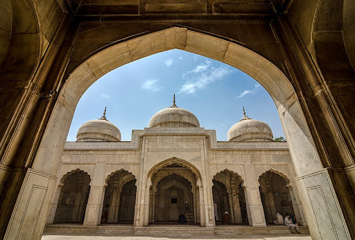 Constructed between 1630 and 1635, Moti Masjid reflects the meticulous craftsmanship of its time. The façade, characterized by cusped arches and baluster columns, exudes a sense of grace and symmetry typical of Shah Jahan's era. Its three superimposed domes and intricate pietra dura work on marble columns highlight the mastery of Mughal artisans, showcasing their skill in blending aesthetics with religious reverence.