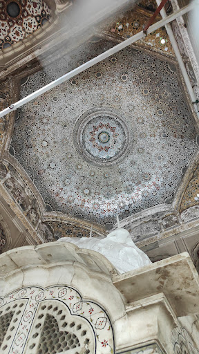 The building has gilded fluted domes and cupolas, and an ornate balustrade around the upper portion of the building. The front of the doorway has images of Ganesh, Devi and Brahma that are cut from red sandstone. The dome is decorated with Naga (serpent) hood designs - the product of Hindu craftsmen that worked on the project.The wooden panels on the ceiling are decorated with stained glass work, while the walls are richly decorated with floral designs. The ceilings are decorated with glass mosaic work. Ranjit Singh's ashes are contained in a marble urn in the shape of a lotus, sheltered under a marble pavilion inlaid with pietra dura, in the centre of the tomb. Surrounding him, in smaller urns, are the ashes of four sati queens and seven concubines. Two small monuments to the west of the main building commemorate Maharaja Ranjit Singh's son Maharaja Kharak Singh and grandson Nau Nihal Singh, along with their wives. The building is located adjacent to Gurdwara Dera Sahib, the place where martyrdom of Guru...