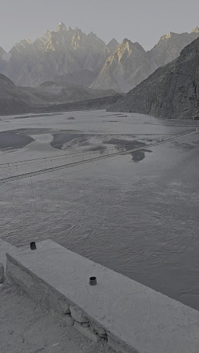Hussaini suspension bridge is a bridge built over Hunza River at Hussaini village downstream from confluence of Hunza river and Shimshal stream. It connects Hussaini village to Zarabad village that is on other side hidden from the eye by the tall hill shouldering at the other side. It is possibly the only way into Zarabad during high flow season in Hunza River. As like most of the villages these are also agricultural and farming communities. Most of the youth here is engaged or employed in tourism sector. Literacy rate is high thanks to The Agha Khan Foundation. People are hospitable and welcoming. The bridge itself dates back to 1960's, being rebuilt many times till now. Construction is simple wooden planks and supporting cables anchored on both sides. Wooden planks are placed about one foot apart. Total length of the bridge is about 200 metres. Tourists pay a fee of Rs. 100 to enter the bridge side, fee is mandatory whethdr one crosses the bridge or not. It iz advisable not to cross if one has motion sickness, vertigo or fear of height or some other health condition. Moreover the bridge is closed to tourists during high winds, rain and snow. I recommend that if the conditions permit one must try the experience, it sure...