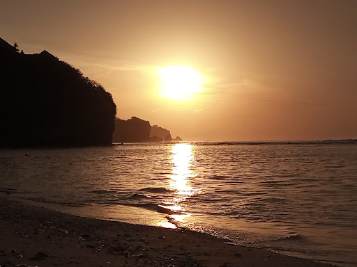 Pantainya termasuk bersih dr sampah2 manusia.. Terlihat "kotor" dgn rumput2 laut yg terbawa ketika pasang. Pantai ini memungkinkan utk berenang. Pasir yg cukup luas dan nyaman utk berjemur. Sayangnya, hari ini, ngga kedapetan sunset, krn tertutup awan dan karang besar dr pantai nun jauh di sana...
