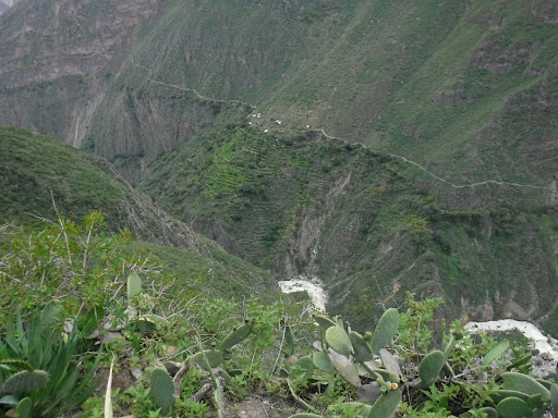 6-7 hour bus ride from Arequipa (terminal terrestre, Arturo Ibanez 130) to Cabanaconde. Route over highlands, vicuna reserve, down to Chivay in canyon, then down canyon, (best views from right side of bus). 9:30 AM Arequipa departure (Andelusia) and nights in Cabanaconde before and after self guided trek, seemed better than 3:00 AM Arequipa departure, short last trek day and back to Arequipa of tours. Many places to stay, I was at Pachamama hostel about 2 blocks up from the plaza on San Pedro St. Good information about trek options and good place to meet others doing unguided treks. I did 2d/1n trek, 1st day to Llahuar with scenic descent along canyon edge, then down into side canyon, final descent to Colca river crossing, climb into Taruna, back down to Llahuar on the Colca river just after crossing the Huaruro river. Nice bungalows on river, friendly staff, fixed menu dinner, breakfast and sandwichs available, all at very reasonable prices. Natural hot pools and swimming pool right on river not open because river very high in early March. Very ambitious new "restaurant" construction ongoing. As hike to Llahuar mostly down and not too long, I was there well before noon. Could just chill in nice location. I opted for day hike up Huaruro canyon that starts steeply right from Llahuar then more gradually up to Llatica where a bridge crosses the river. From there another steep climb to high trail that contours back down other side of canyon to above Belen. Nice safe and scenic canyon trails. Down main street in Belen past soccer field to steep trail to Paclla. Cross road and continue on trail down through terraced gardens that eventually goes to Taruna above Llahuar. This added another 11 km and 700m vertical, about 4 hours at a fast pace, to first day. 2nd day back up to Belen, options are trail short cuts to Paclla not too steep, then very steep to Belen, or longer but more gradually walk on road. From Belen you are on road up to viewpoint bend then level to shortcut trail down to plateau, join main trail down to Sangalle (relatively touristy and expensive, but amazing given that everything has to come in by horse or burro). That just leaves the 2.5 - 3.5 hour all uphill switchbacks to plateau and final km to Cabanaconde. Total for 2nd day a healthy 16-18km with 1700m elevation gain. If I was doing it again, would spend 2 nights in canyon, 1st at Llahuar, then 2nd up at Fure with day hike up to the waterfall (cataratas), day 3 high trail back from Fure contouring back to join road at high point above Sangalle, then through Sangalle up and out. Another interesting high altitude strenuous option might be continuing up from Fure to Tocallo at 3800m where some maps show a trail that goes in and out of several canyons with final pass then long descent to Malata above Sangalle. Another night in canyon and some local information about condition of trails would be needed. Canyon country was unique, scenic and very green with lots of water in the rainy season. Lodging and meals in many areas down in canyon allows for very light packs, a plus given all the climbs. No reservations needed for anything during rainy season, probably a different story in high season. A minibus service that goes on the not too scary dirt road from Carbanaconde, crossing the Rio Colca at the same place my trek did has beautiful brand new rain sheltered stops at all the little towns all the way to Tapay! This allows some less strenuous options for the canyon that are sure to become...