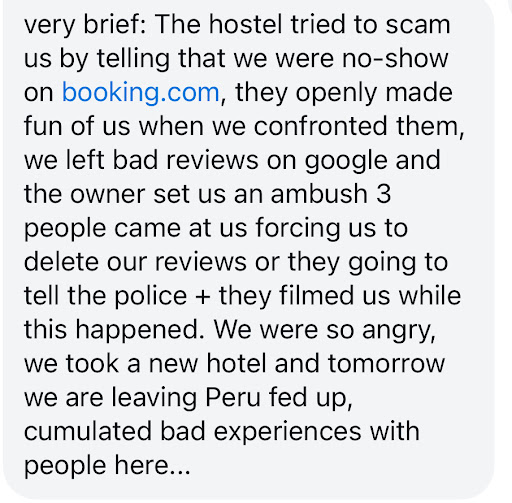 Finally I tried to de-escalate the situation and asked her to see the family room but to my horror, I found painted-over mold all over the bathroom wall. I asked her how she could possibly charge me more for such moldy rooms and her response was that they could clean it. I suggested scrapping the entire hostel and starting from scratch since this seemed to be a structural issue with the building and their lack of maintenance in the long-term. Maria (understandably) got upset and we decided that I should leave. She made me wait an hour to give me exact change for the night I didn’t stay. Like she literally could have just reimbursed the amount immediately on my card (original form of payment) but for some reason she insisted on giving me cash she clearly didn’t have.