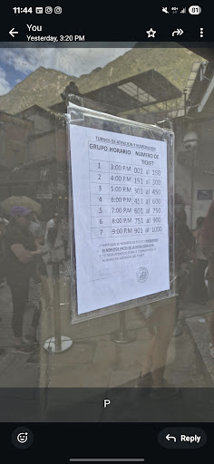 Returned at 1445 to make sure we didn’t miss anything at 1458 they started calling numbers (glad we got there a little early) because the 2 people who were in front of us (Who had ticket #1 & #2) were not there. We then went inside and after a minute were able to go up to the counter and purchase our tickets for circuit 1 or 2 + Inca bridge for 0600. We were done by 1505.