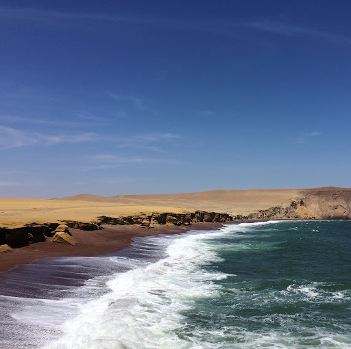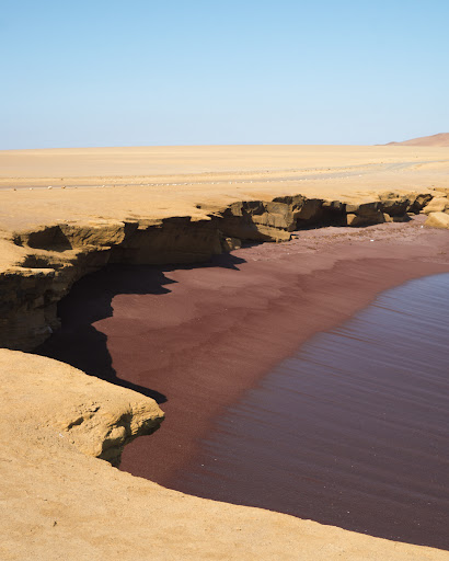 Playa Roja is a beach of absolutely stunning beauty in Paracas National Reserve in Paracas, Peru known for the deep reddish color of the sands along its shore. This characteristic, most unusual along the Peruvian coast, has left visitors amazed and in awe for many years. When the waves of the Pacific Ocean crash against the cliffs of Punta Santa Maria, located slightly south of Playa Roja in Paracas, they pick up trace amounts of the red rock that makes up these cliffs, and over time, the receding tide has deposited enough of those fragments to create a sandy beach of the same rusty, reddish hue. The result is beautiful, bordering on the otherworldly: the blue pacific waters passing over the deep red sands.