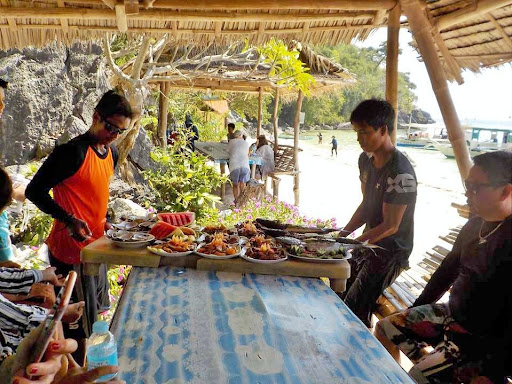 Si tratta di una spiaggia che volge ad ovest, come indica il nome stesso. Si trova sulla costa ovest della Coron island, in una piccola sequenza di spiaggette intagliate nella scogliera a picco sul mare, che sono state attrezzate per consumare il pranzo dei vari tours. Nella piccola spiaggia vi sono una mezza dozzina di tettoie che proteggono tavoli di varie dimensioni. Noi si era in 18, e una tavolata è stata imbandita con piatti di ostriche, pesci grigliati (salmoni e tonni), mix di verdure cotte in padella, pollo in adobo e frutta (anguria e banane). Io ho apprezzato il salmone con zucca saltata, poi anguria. Non so se intorno vi sia del reef, dopo pranzo ci siamo...