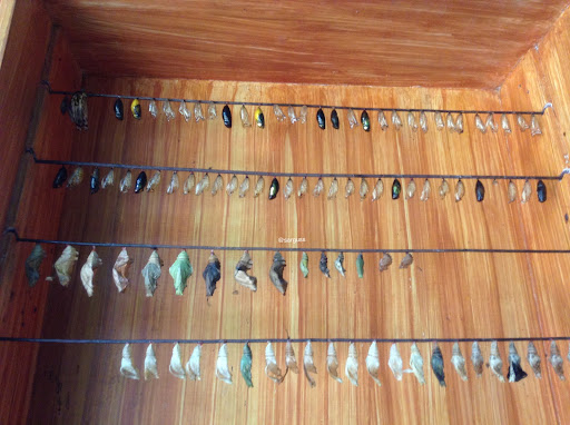 When we first entered, we didn’t see that many butterflies. I was right. Most of them will fly away at the first signs of humans. So I busied myself with the other features of the place. Curiosity led me to this wooden shelf with curious little things stuck to it. It turned out to be the chrysalis of butterflies! It was the first time I saw a chrysalis. It was amazing to see something so tiny. Imagine that from them, beautiful creatures will emerge.