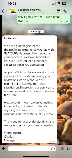 PLEASE READ IF YOU DON’T WANT YOUR VACATION RUINED. Seatours Palawan is by far the worst tour company I’ve ever hired. Let me start by saying that once they saw this negative review they tried to ‘buy us’ by offering a full refund if we took down the review from Google and trip advisor (that’s why they had 5 stars to begin with, because they probably they buy people off; but not me!) From the start, they asked for an advance deposit for Tours A, B, C, D, and Sunset but took days to confirm receipt—even when the bank had already done so. Only after we insisted did they ‘find’ the payment. Day 1 - Sunset Tour We arrived at their office excited, but that quickly changed. The receptionist was rude, barely made eye contact, and showed no customer service skills. When we asked about the tours, she sarcastically pointed at a wall poster and dismissed our weather concerns with, “I can’t predict the weather.” She later mocked us with staff members. Our guide was equally unprofessional—he didn’t introduce himself, barely spoke, and lazily took us to the nearest beach to watch the sunset. After the tour, their office was closed, and no one was available to take us back. The guide had to pay for our transport from his own pocket. Day 2 - Tour A We hoped for a better experience, but the same rude receptionist greeted us. They rushed us to pay for snorkel rentals without letting us properly check the gear. Our new guide wasn’t rude but was completely unprepared—he didn’t explain anything at the stops and abandoned us during snorkeling. This was unsafe for inexperienced swimmers. At lunch, he insisted we eat on the boat because the beach was “too crowded.” We later realized they were just too lazy to set up a proper beach lunch. The crew of five barely did anything; most of them slept. Worse, they openly made jokes about us in Tagalog. We also rented a GoPro from them, but it didn’t work, ruining our first snorkeling experience. When we complained, they refunded the fee but never apologized. Once again, we had to beg for transport back to our hotel. Day 3 - Tour B We didn’t request the same guide, hoping for a better one, but they assigned him anyway. When we asked about the GoPro they promised, the receptionist casually said, “Oh, the battery isn’t working.” Again, we had no way to record our snorkeling day. They continued rushing us to pay for snorkel rentals, and once in the water, most of the gear fogged up, making them unusable. At lunch, the guide tried the same boat-lunch excuse, but this time we demanded to eat on the beach. Later, he dropped us near a cave full of sea snakes and sea urchins, left us alone, and stayed on the boat. This was reckless and unsafe. We also saw many fish we wanted to learn about, but no guide was there to educate us. Filing a Complaint & Refund Request We debated continuing with them or demanding a refund. At the office, we submitted a written complaint. The receptionist mocked us by reading it aloud sarcastically and laughing with staff. She refunded the remaining tours but ridiculed us when we asked for ₱200 back for defective snorkel gear. As we left, we could still hear them talking about us, but we were just relieved to be done with them. Thankfully, H Hotel helped us book the rest of our tours with Discover El Nido, which turned out to be incredible! Their guides were professional, fun, knowledgeable about marine life, and even had a karaoke on the boat, making our final days unforgettable. DO NOT HIRE SEATOURS PALAWAN! They ruined three days of our trip. They likely pay for Google ads, but don’t let that fool you—your time and money are valuable. Instead, book with Discover El Nido for a stress-free and amazing experience!