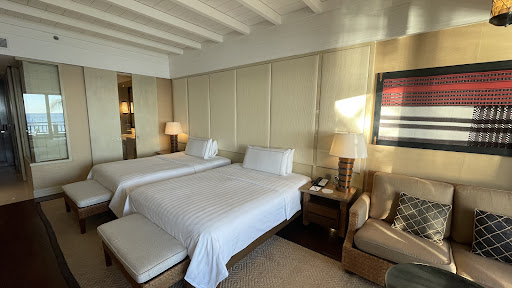 The bed was so comfortable that it made waking up in the mornings difficult! The bathroom was equally luxurious, boasting two sinks (one for each of us) and a bathtub with a view of the beach. We did encounter a minor issue on the first night due to a slight smell of wet wood near the bed, but the staff promptly resolved it by bringing in a humidifier and spraying the signature Shangri-La scent. The room’s interiors were beautifully curated, showcasing Filipino design elements and artworks. Though our room was quite a walk from the lobby, the option to call for a buggy made navigating the resort hassle-free.