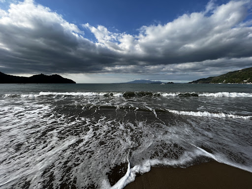 The beach itself has very fine, dark brown sand. It was wavy and surfy.