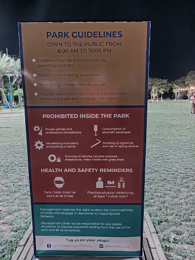 A newly opened park in the Filinvest area, converted from one of the many empty lots in the area behind Festival mall. It just opened on Fri., Mar. 25, 2022, so as of my visit it had been open for only 2 days, and that was fairly obvious from the lack of development. Unlike the nearby Molito Lifestyle Garden, there were no chairs or tables. But one advantage it has is that it has several pieces of playground equipment, including a proper jungle gym with slide, and various contraptions where one can do bodyweight exercises. Also, there's a bike rental.