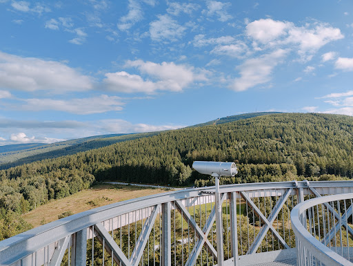 Read moreWieża widokowa oddalona zaledwie ok 20 minut pieszej wędrówki od wyciągu, również można w jej pobliże podjechać samochodem i zaparkować go za darmo przy głównej trasie. Wieża znajduje się na szczycie góry Młynica (653 m.n.p.m.) ale nie ma co się martwić jeżeli dojedziemy tam samochodem to jest płaska trasa. Wieża ma dwa podesty widokowe jedne na wysokości 15,5 m a drugi na wysokości 23,7 metra całośośc jest wysoka na 33,8 metra. Żeby dojść na sam szczyt trzeba pokonać 148 schodów. Całość wykonana jest ze stali. Wieża jest młodszą darmową "siostrą" płatnej wieży Sky Walk. Na szczycie wieży znajdują się darmowe lunety do oglądania okolicy oraz tabliczki z oznaczeniami jakie atrakcje znajdują się daleko przed nami i na co aktualnie patrzymy. Wieża nie jest mocno turystycznie oblegana więc polecam odwiedzić ją jako taki max. 2 godzinny spacer ze Świeradowa (w obie strony). Przy wieży znajduje się miejsce z pieczątką gdzie młodzi wędrowcy mogą sobie wbić ją do zeszytu zdobycie kolejnego szczytu. Widok mamy z tego punktu całą panoramę miasta, okolic i...