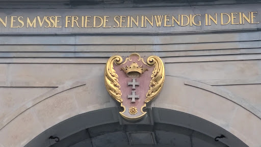 On each side of the gate, you’ll find attiques featuring sculpted figures representing civic virtues—Peace, Freedom, Fortune, and Fame on one side, and Concord, Justice, Piety, and Wisdom on the other. These values speak to the ideals that shaped Gdańsk during its time as a flourishing port city within the Hanseatic League. Just above the archway, a Latin inscription reads: “Small republics grow in harmony, large ones fall through discord,”—a timeless message that still resonates today.