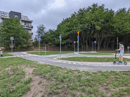 Read moreCiekawa miejscówka na niedługi wypad z dziećmi. Miasteczko drogowe może nie tylko bawić dzieci, ale i uczyć znaków pionowych oraz poziomych. Tylko zjeżdżalnia nie do końca przemyślana - bardzo strome podejście na schodkach z drewnianych palików i strony zjazd, przy którym można sobie łokcie obetrzec. Mały teren spacerowy po ścieżce pośród drzew, ale za to przyjemny, aż szkoda, że nie stanowi większego parku :) Mini skatepark ukryty za drzewami oraz ogrodzony plac dla psów - super! Są ławki, więc jest gdzie usiąść, a jak się pójdzie ścieżką w górę, to można dojść to ogrodzonego terenu z dwoma wiatami i...