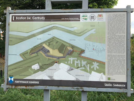 Read moreBastion św. Gertrudy - bastion typu nowowłoskiego, budowany w latach 1607–1638 w Gdańsku, jedyny zachowany w oryginalnym kształcie i ostatni z zachodniego ciągu fortyfikacji[ Jeden z czternastu podobnych bastionów, którymi obwarowano miasto w XVII wieku, zlokalizowany na Starym Przedmieściu w okolicach Dolnego Miasta. Przylega do niego Brama Nizinna z 1626 roku, która łącząc go z Bastionem Żubr, broniła dostępu do miasta od strony Żuław i Traktu Tczewskiego. Powstał według projektu miejskiego fortyfikatora Antoniego van Obberghena. Jest elementem fortyfikacji stałej, wznoszonej na załamaniach obwarowania twierdzy, na planie pięciokątnego masywu ziemnego; jego wnętrze kryje rozległe kazamaty o ceglanych murach i sklepieniach, w których znajdowały się magazyny prochu i amunicji oraz wozownie artyleryjskie. Tyle historii. Dziś miejsce spacerów i w przeciwieństwie do starówki, mało uczęszczane, warto wybrać się, żeby chwilę...