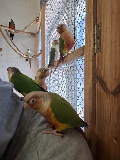 Papugi są tak towarzyskie,że nie czekając na zaproszenie odwiedzającego od razu siadają na nim...na głowie, ramionach :D