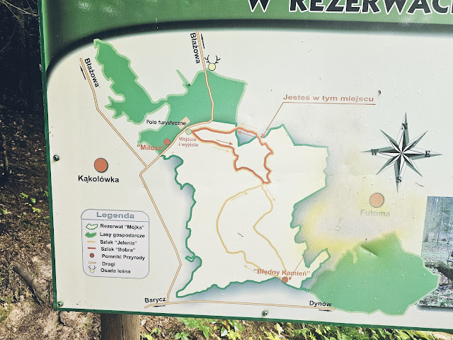 Kolejne miejsce znalezione przypadkiem i kolejny dowód na to, że ścieżki edukacyjne w lasach nie są wcale nudne. Drewniane mosty, pomosty, piękne malownicze wąwozy, ścieżki trudniejsze i łatwiejsze, jedne bardziej strome z wystającymi korzeniami drzew, inne blotniste i płaskie. Do tego wieża widokowa i wspaniały zapach ściółki, lasu i grzybów. Są tu wytyczone dwie ścieżki - szlak bobra czerwony i jelenia żółty z pomnikiem przyrody błędny kamień. Wydaje się, że przejście zajmie tylko chwilę, ale tak naprawdę można tam chodzić dobre 2-3 godziny jak nie więcej, w zależności od ścieżki, którą wybierzemy. Wbrew pozorom szlak nie jest wcale taki łatwy, czasem trzeba pokombinować jak wejść na strome, śliskie zbocze. Należy zabrać koniecznie dobre buty. My szliśmy akurat po deszczu więc dla najmłodszego uczestnika wycieczki było to nie lada wyzwanie, bo ścieżka zmieniła się w wielu miejscach w błotnistą ślizgawkę. Lokalizacja rezerwatu - na terenie wsi Kąkolówka i Futoma. Obok wejścia na ścieżkę znajduje się duży parking i miejsce na ognisko. Na pewno tam...