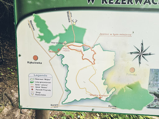 Read moreOdwiedziliśmy go w lipcowe, niedzielne popołudnie. Spacerowiczów było niewielu pomimo sprzyjającej pogody. Najwięcej osób spotkaliśmy na samym początku przy wiacie (gdzie smażyli kiełbasę na ognisku), tuż obok niewielkiego parkingu, skąd najlepiej rozpocząć wędrówkę po rezerwacie. Są tam dwie ścieżki: czerwona (krótsza) bobra oraz żółta (dłuższa) jelenia. My przeszliśmy obie i zajęło nam to około 2 godziny, pomimo znacznie dłuższego zakładanego czasu. Ścieżka bobra jest według nas mało atrakcyjna i dość krótka, jedyny ciekawy punkt to mini wieża widokowa. Ścieżka jelenia jest dłuższa, bardziej widokowa, a na końcowym jej odcinka znajduje się błędny kamień i tuż za nim miejsce na ognisko z ławkami i stołem. Wybierając się do rezerwatu warto założyć obuwie trekingowe z uwagi zarówno na kałuże i błotnisty teren po opadach deszczu, jak i miejscami bardziej strome podejścia. Reasumując, na nas rezerwat ten nie zrobił większego wrażenia. Ponadto nieczytelne...