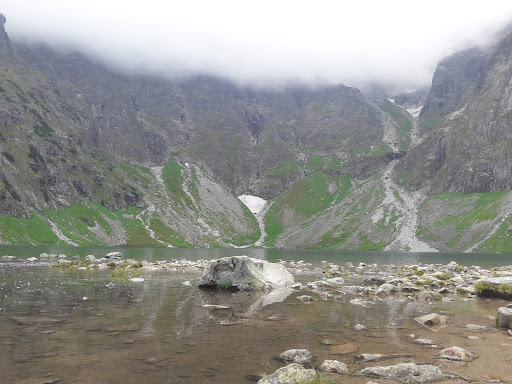 Read moreNajpiękniejsze miejsce, ładniejsze niz MO. Sam staw jest cudny, pięknie położony między zboczami. Zaletą wielką jest jednak odległość os MO i nie ma tam tylu człowieków przynajmniej z rana. Taki jeszcze prawie nietknięte przez człowieczą głupotę, choć jest tam coraz więcej turystów. Coraz więcej tych z "autostrady" znad Morskiego Oko nieprzygotowanych, a zarazem głupich. Jak zawsze polecamy wybrać się tam jak najwczesniej. Droga z MO do podejścia na szlak do Czarnego Stawu jest łatwa, najlepiej od zejscia w lewo - najszybciej i najłatwiej. Czasem ślisko i mokro lecz prosto i szybko 15-30min w zależności od kondycji. Sam szlak i podejście główne zaczyna się łagodnie. Całość nie należy do trudnych lecz są takie 3 miejsca, gdzie zapewne niektórzy wspomogą się rękoma, a schodząc dodatkowo pupą. Wejście strome, czesto mokre i lepiej mieć wolne ręce , a nie trzymać gowniane aparaciki cyfrowe za 500+ myśląc ze się jest artystą lub kurteczki, torebeczki - lepiej mieć wolne ręce by się złapać lub podeprzeć, podać komuś rękę. Nie polecam ludzikom bojącym się przestrzeni i wysokości. Także tym klapkowiczom z MO, którzy ambicjonalnie chcą dalej i wyżej, a tworzą zagrożenie dla innych ( jeśli ktoś idzie wolno i widać jest przygotowany ok, lecz jeśli czuć alko i sandałki i targa bachora i zapier...ala nie patrząc na innych rozpychając się i ślizgają to zabije siebie i innych) mówimy NIE, niech siedzą nad MO. U góry jest już widok na MO na schronisko na otaczające zbocza i podejscie na Rysy. Samw otoczenie stawu płaskie w porównaniu do wejścia oraz mniejszą ilością człowieków. Oczywiście z rana będziemy się tym delektować, 9 godz. na górze może okazać się opcjonalna (niestety już będą ludki) lecz lepsze są wcześniejsze godziny. Droga za kaskadą opadajacą w dół, czyli w lewo od wejścia wiedzie na Rysy. Warto tam się udać chcąc by uniknąć przesiadujących nad Czarnym Stawem ludzi. Udało się spotkać podążajacych w tamtym kierunku na ścieżkę na Rysy maruderów z rozpasanymi koszulami i mokasynkach - pytanie idioci, czy samobójcy? Musieli dziwnie wyglądać przy tych z kaskami, linami...