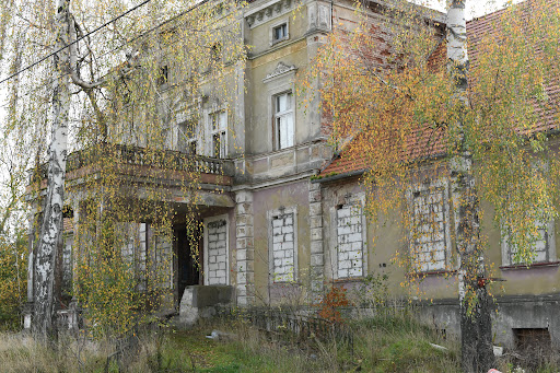 Read moreRobi wrażenie... Kiedyś piękny, z podjazdem. To w nim mieszkał książę Wilhelm Hohenzollern z małżonką Dortheą von Salviati i dwoma córkami. Małżeństwo,które było mezaliansem i miłość, dla której Wilhelm zrzekł się praw do korony... Niestety opuszczony w 1944 r. przez Dorotheę z córkami i jej matką z obawy przed zbliżającymi się wojskami radzieckimi (Wilhelm już wtedy nie żył, zginął od ran odniesionych w czasie inwazji na Francję, w Nivelles w Belgii, w szpitalu polowym)... Pałac po II wojnie światowej zaczął podupadać. Teraz widać, że ktoś go remontował, ale... hm... chyba już przestał...🤔Zachowały się futryny i drzwi ,reszta to goła cegła. Jednak z zewnątrz duża ilość zdobień, które też dodają mu uroku... Mimo wszystko...