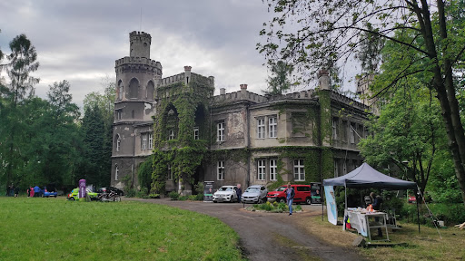 "Klikając" dwie gwiazdki pojawia się napis "nieciekawe". Proszę się tym nie sugerować. Miejsce zdecydowanie jest ciekawe ale... No właśnie, zawsze jest jakieś ale a w tym przypadku dotyczy stanu obiektu. Neogotycki pałac, otoczony sporym parkiem ma potencjał! Niestety, choć jak słyszałem, jest w rękach prywatnych, to jego stan przywodzi na myśl słusznie miniony czasy. Nie chciałbym się "czepiać". Wiem z jakimi problemami i kosztami wiąże się restauracja zabytku. Doceniam to, że piętro zostało odświeżone ale parter wygląda strasznie a o suterenach lepiej nie wspominać. Organizowanie imprezy masowej wymaga przynajmniej uprzątnięcia śmieci a nie przykrywanie ich plandeką. Słupki podpierające rozpadający się daszek stoją, choć ich podstawy dawno spróchniały. Pręgierz i Karczma Żym (pisownia oryginalna), są żywcem wyjęte z pracowni teatralnej, choć muszę przyznać, iż wykończenia styropianu dobrze imitują kamień. Park przypomina dżunglę. W tym sezonie nie tknęła go kosa, nie wspominając o rękach ogrodnika. Wielka szkoda, ponieważ jak wspomniałem na początku, miejsce ma...
