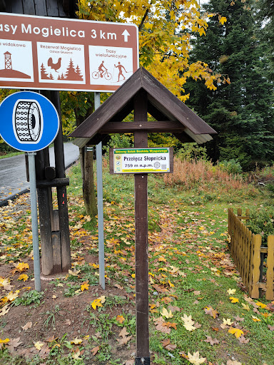 Przełęcz Słopnicka 759 m n.p.m. leży między wzniesieniami Cichoń a Zapowiednica. Przez przełęcz biegnie droga ze Słopnic do Zalesia. Na przełęczy znajdują się ławki dla turystów, figurka i tablica z małopolskim szlakiem papieskim. Dzięki temu, że przełęcz jest bezleśna, niezabudowana, odsłonięta na znacznej długości, rozciągają się stąd szerokie widoki. Widać stąd między innymi Modyń, Łopień, Mogielicę, Ostrą i Cichoń. Przez przełęcz biegnie szlak na...