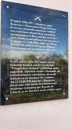 26 sierpnia 1813 r. w pobliżu Dunina rozegrała się jedna z bitew wojny napoleońskiej, zwana „Bitwą nad Kaczawą”. Naprzeciw siebie stanęły wówczas napoleońska Armia Bobru, którą dowodził marszałek James Macdonald oraz prusko-rosyjska Armia Śląska dowodzona przez feldmarszałka Leberechta von Blüchera. Decydująca walka rozegrała się w obszarze ograniczonym miejscowościami: Warmątowice, Bielowice, Winnica, Janowice Duże. Od północy teren ten zamykała rzeka Kaczawa, a od zachodu i południa Nysa Szalona. Przed bitwą przez wiele dni padały w tym regionie ulewne deszcze, broń palna, oprócz armat, zamokła. Dlatego walkę stoczono na bagnety i szable. Dzięki temu, że armia rosyjsko-pruska miała znakomicie rozlokowaną artylerię na południe od Warmątowic, udało jej się pokonać wojska napoleońskie. Chociaż Bitwa nad Kaczawą nie miała większego znaczenia strategicznego, to w celu jej upamiętnienia w 1908 r. wzniesiono koło Dunina kamienny kopiec z kul armatnich zebranych z pola bitwy. W 1909 r. w miejscu kopca wybudowano pawilon w kształcie wielobocznej rotundy i umieszczono w niej pamiątki z wojen napoleońskich. Eksponowane przedmioty były darami od osób prywatnych. Muzeum Bitwy nad Kaczawą funkcjonowało do 1945 r. Dopiero w 1996 r. zostało...