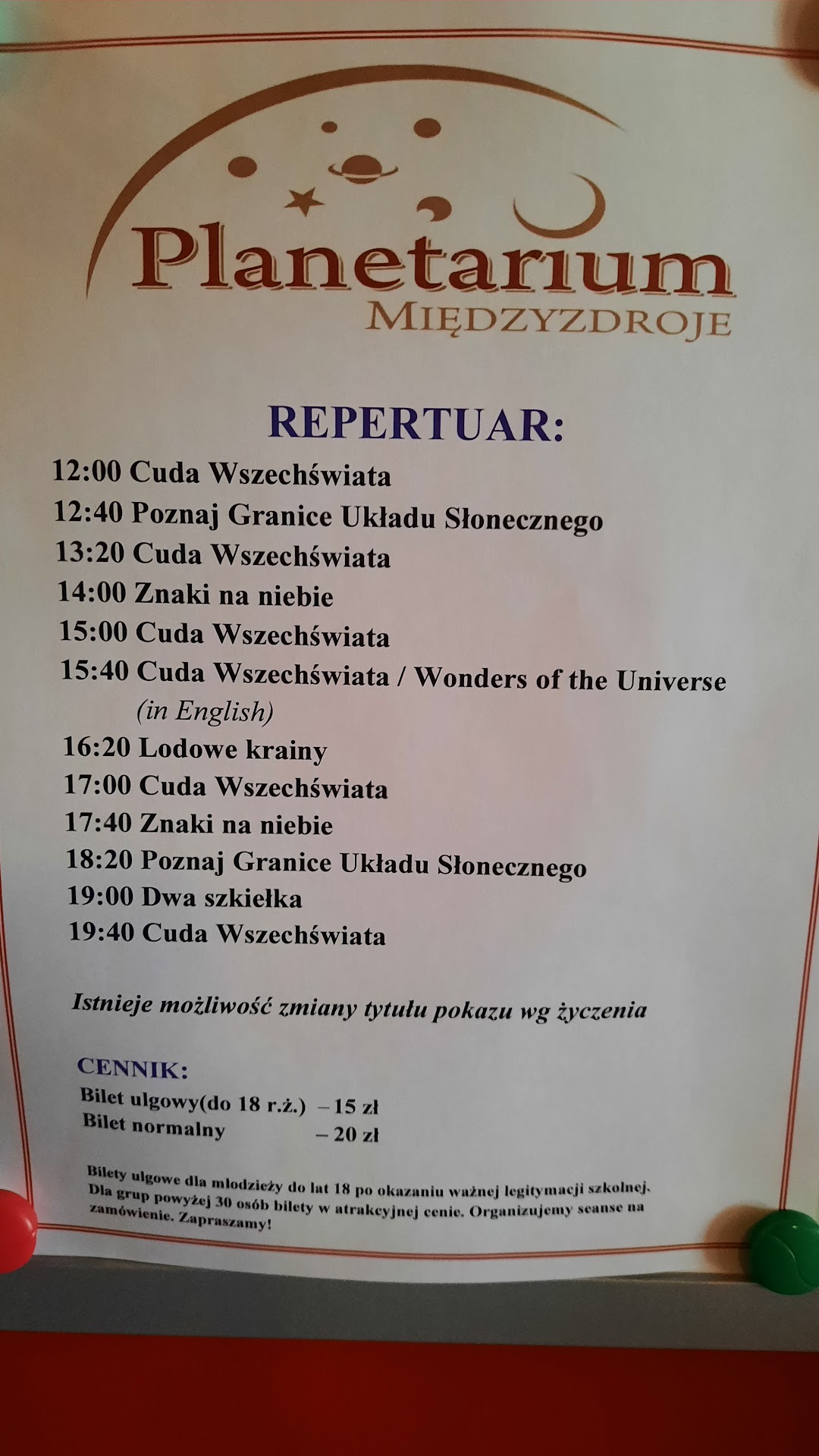 Read moreСобрались вместе с семьей сходить в так званый Планетарием , я думаю как и все туда сходили только один раз , так как второй раз не кто в жизни не пойдет , билет для взрослых 25 злотых , билет для детей 20 злотых , за семью заплатили 90 злотых ! Теперь про фильм , в помещении очень холодно так как там не отапливают, качество фильма такое ощущение что взяли телефон с 2000 года и растянули его на весь потолок , яркость будто на этом фильме сэкономили, бо такое ощущение будто дали сначала в глаза и мы пытались понять что нам показывают , честно из своего мнения не советую туда ходить так как это бессмысленная трата своих денег, но все же если вы попадаете туда то вас ждет чудесная новость что все это закончится через 20 минут ,...