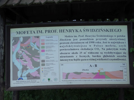 Mofeta w jastrzębniku koło Muszyny. Opinia Stanisława Mofetą nazywa się otwór, z którego wydobywają się gazy Pod nazwą mofeta kryją się też ekshalacje gazowe czyli wyziewy gazów z głębi ziemi, z charakterystycznym bulgotem. Mofeta im. profesora Henryka Świdzińskiego to największa w Polsce mofeta, odkryta przez profesora. Znajduje się w gminie Muszyna, na granicy Jastrzębika i Złockiego , niemal przy drodze łączącej te dwie miejscowości, na dnie Złockiego Potoku Mofeta im. prof. Henryka Świdzińskiego jest największą i najwydajniejszą w Polsce. Ma powierzchnię ok. 25 m², a ilość wydobywającego się gazu szacuje się na około 10 m³ na minutę. Gaz wydobywa się w tym miejscu stale w postaci bąbelków. Składa się on głównie z dwutlenku węgla (95%), poza tym jest to azot (3,87%), metan (0,67%) i tlen (0,21%). Dwutlenek węgla (CO2) wydobywa się z bardzo dużych głębokości. Nad mofetą giną owady i ptaki. Dwutlenek węgla jest cięższy od powietrza, gromadzi się więc przy ziemi. Jeśli nie rozwieje go wiatr, zabija wszystkie unoszące się nad mofetą owady. Wydobywający się dwutlenek węgla po drodze nasyca wodę, Mofeta ta została uznana za pomnik przyrody. To nie jedyna mofeta w tej okolicy, ale ta jest najbardziej efektowna i zyskała infrastrukturę turystyczną. Zbudowano kładkę ponad rzeką, obudowano otwory z bulgoczącą wodą, postawiono tablice informacyjne. Miejsca, z których wydobywają się gazy, ciekawie nazwano - Bulgotka i Dychawka. Dychawka to słyszalny oddech ziemi, faktycznie można ten oddech usłyszeć. To suchy wypływ dwutlenku węgla. W innych miejscach stale widać na wodze bąbelki, co wygląda bardzo ciekawie i tajemniczo. Mofeta usytuowana jest w dnie bagnistego koryta potoku Złockiego, przez co wypływ CO2 częściowo ma miejsce pod pokrywą wody i dlatego jest doskonale widoczna. W kilku punktach, na powierzchni około 25 m², wydobywają się nieustannie w dzień i w nocy różnej wielkości i ze zmienną częstotliwością bąble CO2. W rejonie tym występuje kilka źródeł wód mineralnych. Największe nazwane jest Bulgotką. Na wyjątkowo atrakcyjną oprawę mofety wpływa bulgoczące rdzawożółte błoto, kolorystycznie kontrastujące z porastającą je intensywnie zieloną, niskopienną roślinnością. Wytrąca się ono z wód wypływających tu szczaw, zawierających dużą ilość związków żelaza i ma charakter koloidalnej, czerwonobrunatnej galaretowatej zawiesiny, cienkiej powłoki lub spienionego żelu. Byłem, oglądałem jest super. Gorąco...