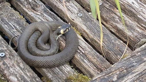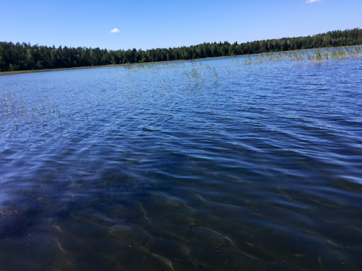 Jezioro w środku lasu, do pomostu podpływają małe rybki. Przy brzegu wygrzewają się jaszczurki....