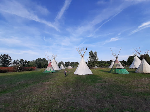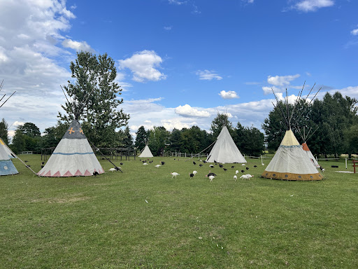 Magiczne miejsce dla tych którzy cenią ciszę i naturę. Nocowałam z dziećmi w tipi i gospodarz przygotował nam w tipi drewno na ognisko, przyniósł metalowe naczynia, wyjaśnił gdzie jest czajnik i lodówka dla gości. Tipi obok jest mini łazienką z zimną wodą. Dzieciaki mają masę atrakcji: strzelanie z łuku, tor przeszkód, muzeum Indian, indiańskie gry i zabawy. Jest plac zabaw i drewniane zadaszone stoły piknikowe. Do tipi zaglądały nam indyki i kury, spały z nami koty i dwa wielkie psy w nocy sprawdzały czy wszystko u nas gra. Na terenie są zwierzaki i dzieciaki mogą oglądać ich karmienie. Jest ok 20min części edukacyjnej w muzeum w ziemiance - przewodnik opowiada tam fascynująco o życiu Indian że moja 8latka była oczarowana. Parking darmowy. Nocleg w tipi 50zł za osobę. W cenie są wszystkie atrakcje wioski indiańskiej. Nocleg w tipi jest chłodny, mało wygodny ale magiczny i twarda gleba nie przyćmiewa radości z zasypiania przy ogniu i patrzenia w gwiazdy oraz podziwiania rano wschodu słońca. Gospodarz zajrzał do nad wieczorem i opowiedział dzieciom legendę Indian przy ognisku a potem zabrał moja starsza córkę na bieganie z latarką po labiryncie na kukurydzy tuż...