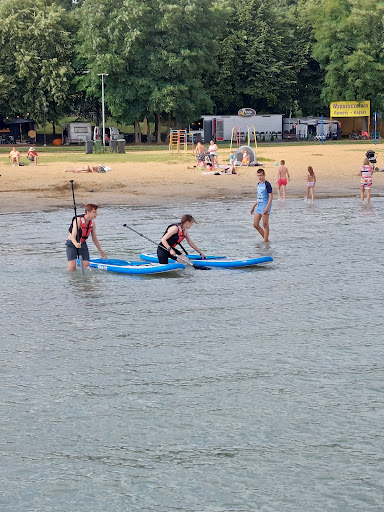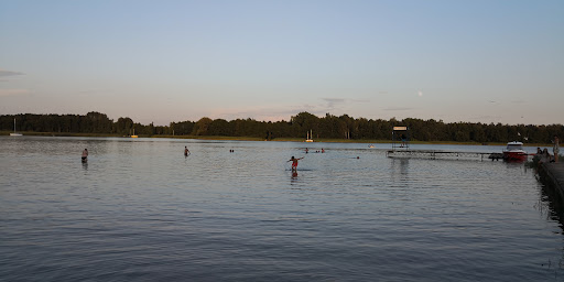 Sama plaża jest w porządku. Są miejsca, zarówno na piasku jak i trawie. Sporo różnych budek z jedzeniem (ryby smażone, gofry, naleśniki, lody, hamburgery, cos jak kfc, kebab, zapiekanki). Jest tez zarówno wypożyczalnia sprzętu wodnego jak i szkoła windsurfingu. Bardzo fajne dla rodzin z dziećmi jest to, że dno opada baaaaaardzo powoli. Jakieś 20m od brzegu woda jest wciaż do kolan a do piersi to jest dopiero ok 40-50m od brzegu. Ma to też niestety duży minus. Jezioro jest SUPER czyste (jesteśmy tu w drugiej połowie lipca) ale jak się wypłynie dalej kajakiem czy rowerem wodnym (widoczność myslę nawet 3 metry) . Ale na kąpielisku, właśnie przez tą płytkość woda jest mega zmącona i widoczność jest jakieś 20 cm... Minusy duże są do władz/opiekunów tego kąpieliska. *W weekendy jest tu multum ludzi na ktorych potrzeby jest jedna i to płatna toaleta. To jest kpina. Dlatego non stop się słyszy ze dzieci idą siku do jeziora. *smietniki z reguły sa przepełnione z których się wszystko w połowie dnia już wysypuje. Wygląda to słabo a jeszcze gorzej pachnie. no i pomost... Jest w stanie urągającym wszelkim zasadom bezpieczeństwa. A zamiast go naprawić lub zrobić nowy to poszli po najmniejszej linii oporu umieszczając zapyziałą karteczkę z zakazem wstępu i tyle w temacie... Ale ogólnie polecam. Dobre, spokojne miejsce do wypoczynku zwłaszcza dla...