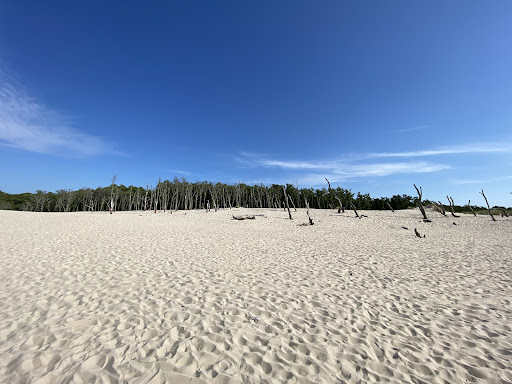 Read moreUrody wydm, ich walorów przyrodniczych nie ma sensu tu oceniać, bo to ocenie nie podlega. Oceniam tu organizację turystyki w tym miejscu i moją prywatną wycieczkę na wydmy, którą miała miejsce w połowie sierpnia. Absolutnie i zdecydowanie odradzam wybierać się w to piękne miejsce w środku sezonu. Mój błąd. Od początku: latem do wydm nie można podjechać, choć poza sezonem jest to możliwe. Dojedzie się tylko do kas przed wejściem do SPN. Parking za słone pieniądze, można skorzystać z powszechnym w Łebie meleksów, za ok 20zl od osoby, niezależnie od wieku, czyli mega drogo. Wejście do parku oczywiście też płatne. Przed kasami już ogromną kolejka. Przy kasach sklepik, gdzie mała butelka wody kosztuje krocie, warto wiedzieć i wziąć potrzebne wiktuały do plecaka z domu. Potem wycieczka ok 4 km, pieszo, ładną ścieżką w lesie, niestety w tłumie ludzi. Obok inna dróżka prowadzi meleksy i rowery. Po drodze widać "turystów", którzy mimo ostrzeżeń, wchodzą na widoczne już wydmy, ignorując granice ścisłej ochrony parku. Następny przystanek to możliwość odwiedzenia muzeum w Rąbce, albo dalszy marsz w kierunku wydm, ok 1,5 km, w lesie. Przed wejściem na szlak, ostatnia możliwość skorzystania z toalety, odczekawszy w gigantycznych kolejkach. Na trakt nie wjeżdżają już meleksy, w sezonie, bo jak nam powiedział kierowca jednego z nich, jest za duze ryzyko zderzeń z rowerami i pieszymi. Tam już jest makabra; marsz dosłownie w tłumie ludzi, między którymi z trudem przepychają się rowery, bezceremonialnie dzwoniąc na pieszych. Nikt nie przestrzega jakichś zasad ruchu, czy cokolwiek. Marsz kończy się tuż przed wejściem na same wydmy. Tam można się wszędzie potknąć o rowery porzucane wprost w lesie, bo parking dla rowerów, z których wiele było wypożyczonych, jest dodatkowo płatny 🤣 Pierwsze wejście pod górę już na wydmie, oczywiście w kolejce ludzi, ale już czuje się ekscytację, że za chwilę zobaczymy piękny widok. I tu już totalne rozczarowanie, bo zamiast urokliwych pejzaży widać po prostu ogromne tłumy turystów, w każdym możliwym miejscu. Z uskoków turlają się dzieci, wszędzie koce, niektórzy już mało trzeźwi, gra muzyka, ludzie się opalają. Harmider i wrzask. Trudno zrobić zdjęcie bez obcych na drugim planie. Ogółem, ciężko przeżyć jakiekolwiek wrażenia, pozachwycać się, pooglądać, choć przecież jest na co popatrzeć. Zejście z wydm było dla mnie prawdziwą ulgą. Gdy wracając do Łeby zapłaciłam za meleks, kierowca opowiedział, że na wydmach można spotkać niejedno zwierzę, można podziwiać orły, ale to wszystko poza sezonem, gdy na wydmach nie ma ciżby ludzi. Na pewno tam wrócę zimą, albo wczesną wiosną. Ale żeby nie było tak całkiem na nie, to zauważyłam jeden pozytyw: ludzie ogólnie mniej śmiecą, mimo powszechnego braku koszy na śmieci, mało kto wyrzuca bezczelnie odpady gdzie popadnie, tu się...