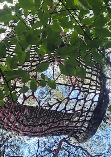 jedno z drzew na którym zawieszone są konstrukcje, obumarło, jest całe okorowane / wyschnięte. Niemniej nadal używane jest jako podpora do konstrukcji🤯