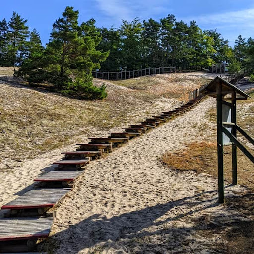 Bardzo ciekawa i atrakcyjna pod względem widoków ścieżka spacerowa - tutaj jest jej początek. Prowadzi początkowo przez las, później przez wydmę, ale nie po piasku lecz po specjalnie przygotowanym drewnianym podejście. Z wózkami dziecięcymi ciężka do pokonania, raczej odradzam, bo podejście na wydmę prowadzi stromymi schodami. Co kilkadziesiąt-kilkaset metrów przy ścieżce umieszczono tablice dydaktyczne, a w połowie drogi znajduje się altana ze stołami i ławkami. Samochód można zostawić około kilometra stąd na parkingu obok miejsca na biwak i dojść spacerkiem (polecam tę opcję) lub podjechać tutaj na...