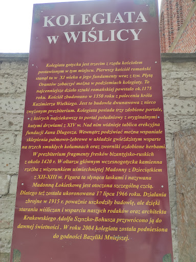 Read moreGotycką bryłę świątyni wzniesiono z kamienia, ale zniszczenia z czasów I wojny światowej uzupełniono ceglanym szczytem. Kościół składa się z jednej nawy z wyodrębnionym, znacznie niższym, prezbiterium. Nad głównym wejściem umieszczono niewielką płaskorzeźbą odnoszącą się do fundacji Kazimierza Wielkiego pokutującego po zabójstwie Marcina Baryczki. Monarcha ukazany jest w pozycji klęczącej gdy podaje Maryi makietę wiślickiej kolegiaty. Za plecami władcy stoi arcybiskup Bodzęta, który popycha Kazimierza w stronę Matki Boskiej. Relief ufundował Jan Długosz przypominając w ten sposób tragiczne wydarzenia sprzed stu lat. Inne płaskorzeźby (herby) umieszczono nad portalem północnym. Kolegiata znana jest m.in z obrazu tzw.Matki Boskiej...
