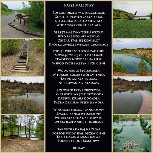 Te kładki w niecce kamieniołomu robią ciekawy klimat, ale z Malediwami bym tego nie skojarzył. Ogólnie dobry pomysł na rekultywację i miejsce wypoczynkowe. Nadal o dziwo czysto. Obecnie północne schody zostały zlikwidowane, dojście tylko ścieżką od "koparek" lub schodkami od...
